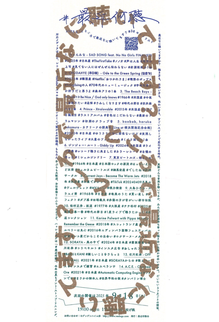 音楽との出会い方も聴き方も十人十色な2025年秋。実際みんなどんな音楽を聴いてるか、1人1曲ずつ音源を持ちよって聴き合い&聴かせ合いの夕べ。2015年からスタートしてすっかりおなじみ、グ邸最多の39回目。対応メディアはCD、レコード、YouTube、スマホなどのステレオミニで繋がる外部機器で。もちろん手ぶら&ご新規さんも大歓迎。お仕事帰りにフラっとどうぞ。ハッシュタグは「#最近何聴」。